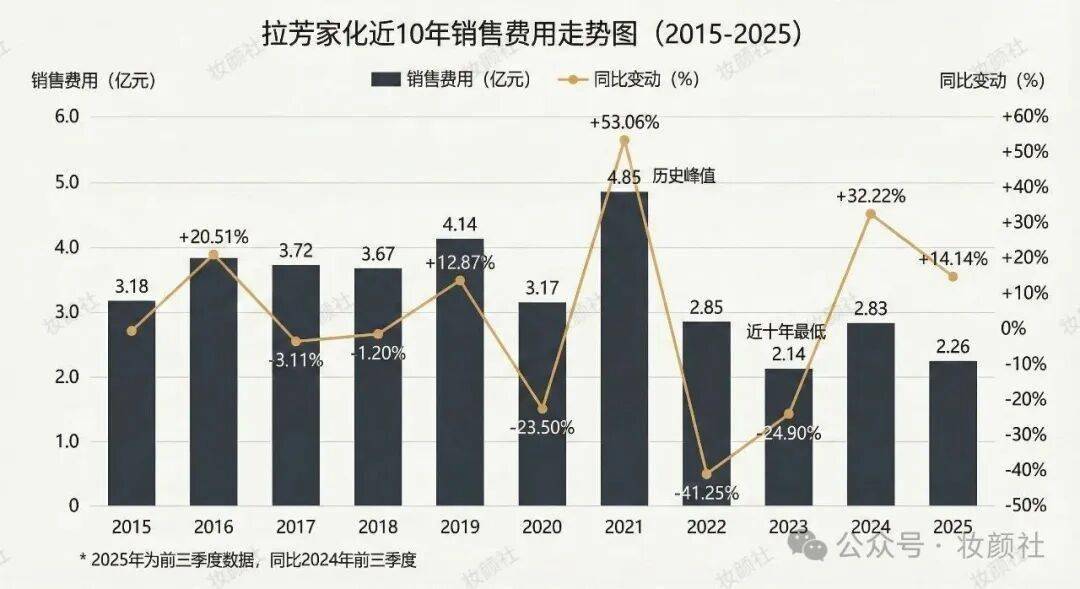 然而,过度依赖营销驱动的发展模式也埋下了隐患。2015年,拉芳在中国洗发水市场的销售额占有率达到2.52%,位列第六,成为当时本土洗护品牌市场占有率最高的品牌。2015年后,拉芳在营销层面开始收缩,2021年销售费用为4.85亿元,2022年降至2.85亿元(同比下滑41.25%),2023年进一步降至2.14亿元(同比下滑24.91%),销售费用率从2021年的44%降至2023年的25%。这种大幅度的营销投入削减,直接导致品牌影响力逐步下降。
