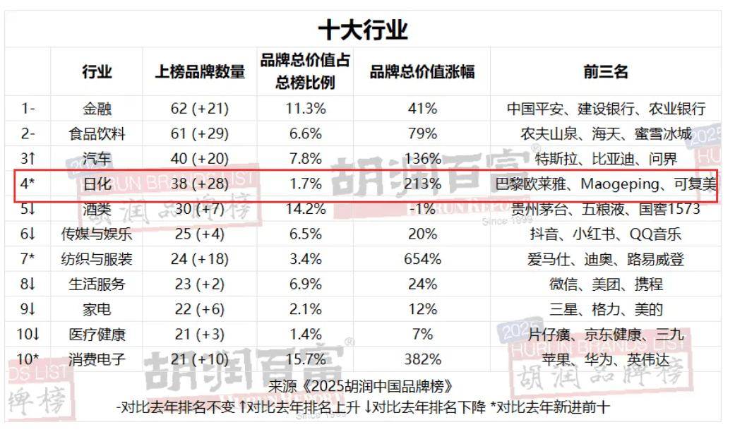 聚焦到榜单来看,上榜品牌来自29个主要行业。其中,化妆品所在的日化行业新晋前十,上榜品牌共38个,品牌总价值涨幅213%,前三名为巴黎欧莱雅、毛戈平和可复美。
