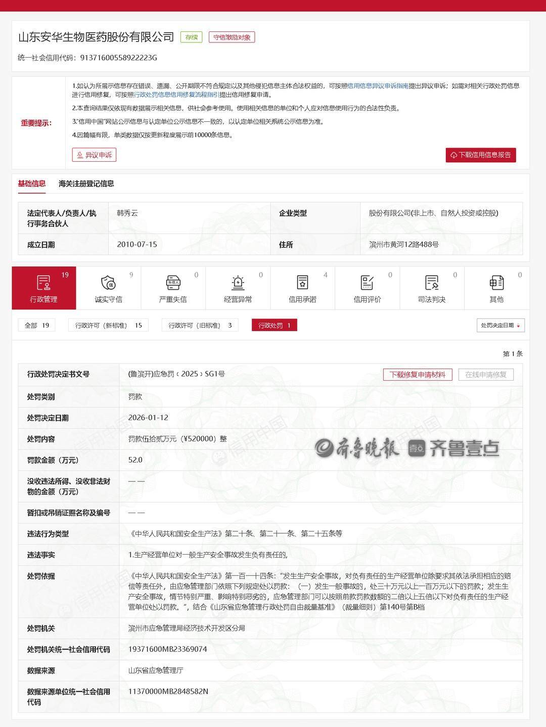 2月2日,据齐鲁晚报报道,山东安华生物医药股份有限公司(以下简称“安华生物”)因对一般生产安全事故发生负有责任,被滨州市应急管理局经济技术开发区分局罚款52万元。