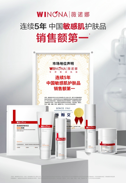 2025年8月,经权威机构沙利文认证,薇诺娜已连续五年(2020-2024)在中国敏感肌护肤品销售额第一,这不仅体现了消费者的高度认可,也印证了品牌经历多年深耕积累的专业壁垒。