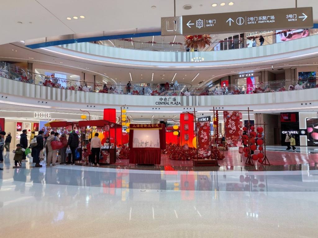 第四,近半数非遗市集(44%)属于商圈“快闪店”,仅有展演、后劲不足。例如七宝领展广场的非遗市集,活动当天有潮汕英歌舞、汪满田鱼灯巡游等活动。但结束之后只留下一个中庭中的6个摊位,周边是新能源汽车、服装店等社区型商业首层最常见的业态,与市集的摊位之间没有共振。市集只是来来往往人流中的一个“环岛”,甚至本身的体积还没有另一个中庭的IP公仔快闪店大。