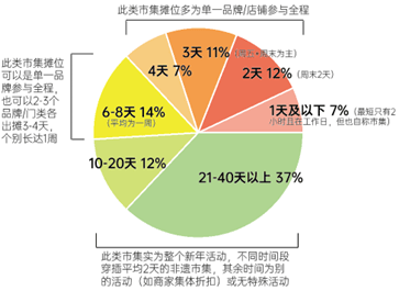 延续约一周(6-8天)的类别占比14%,它们有可能是一个品牌连续一周出摊,也有可能拆分为2-3个非遗项目,每个出摊3-4天。后者还可以呈现在一个20-30天的长周期市集中,每个周末出摊/表演,其余时间市集可能空置,或展示特色农产品。